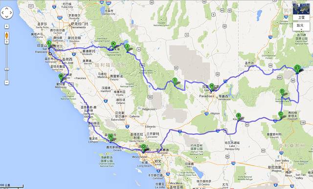 A.洛杉矶 B.金曼 C.威廉姆斯 D.大峡谷国家公园南缘 E.马蹄湾 F.佩吉 G.羚羊谷 H.拉斯维加斯 I.死亡谷国家公园 J.马莫斯湖 K.优胜美地国家公园 L.旧金山 M.蒙特雷/卡梅尔 N Pismo O.洛杉矶