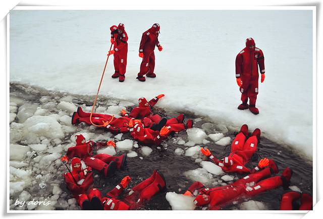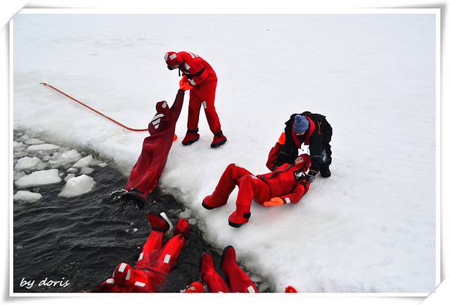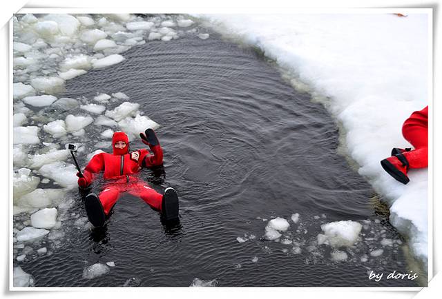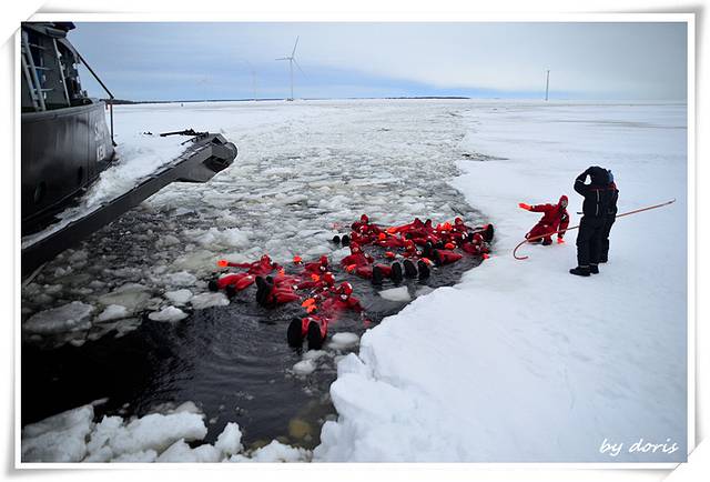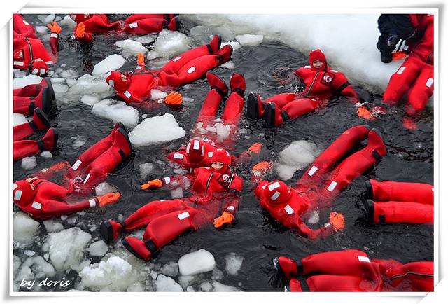 艰难地挪进海里倒是立马就跟只小海豹一样顺溜了,很轻松地飘在海面上,皮肤隔着橡皮制的防护服还是能感觉到冰冷的海水,扒拉了几下就与小伙伴们汇合啦,一高兴抡起一块冰块就丢过去,才想起这是冰块哦不是雪球