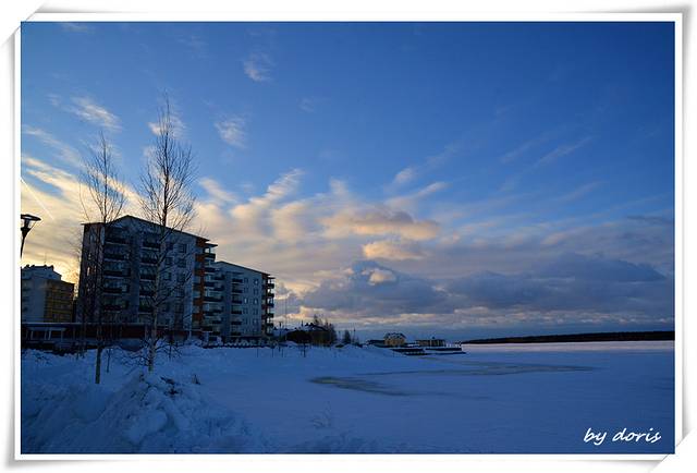 9点的天,好似蒙蒙亮,一路步行前往并不很远的雪城堡,沿途经过一座已冻成冰的湖
