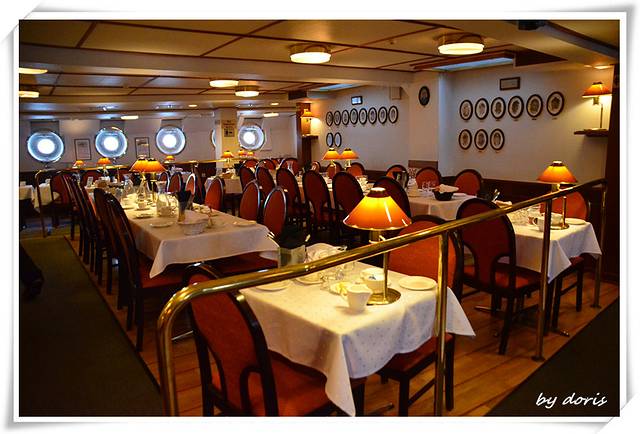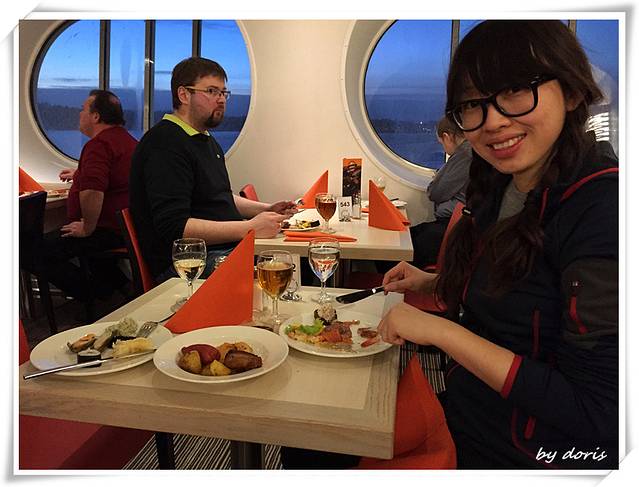诗丽雅号上的自助餐菜式属于维京料理,一般从醋腌鲱鱼开始,先吃小虾等冷的海鲜菜,接着是火腿、小馅饼之类的冷荤菜,之后是肉丸子之类的热荤菜,最后是甜点,如果把热菜、荤菜、海鲜等不同种类都装在一个盘子里则有失礼仪,当时我们才木有顾忌这么多,敞开肚皮吃了,只是不怎么习惯冷菜远远多于热菜的方式,幸好餐厅有热水供应.