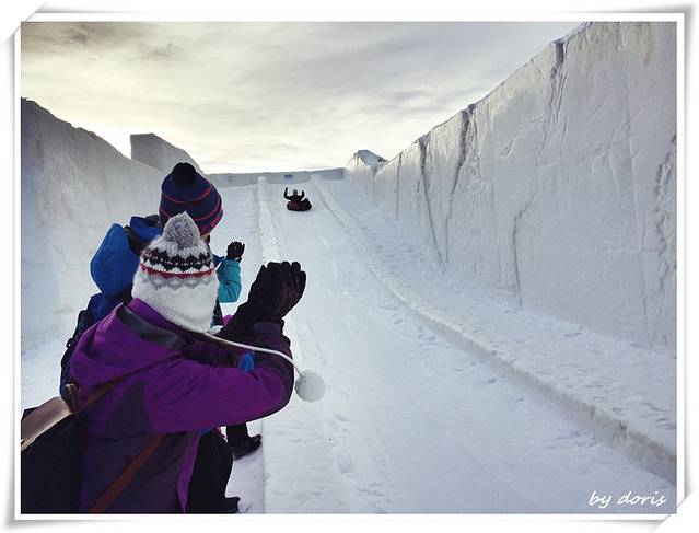 雪城堡不大,一会儿就逛完了,发现户外有个橡皮圈儿滑道,一边堆着几只橡皮圈儿,也没人看管,于是童心大发,玩的不亦乐乎,后来几个老外看我们玩得热闹也加入进来