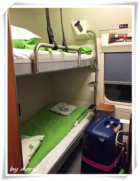 车厢正如传说中的那样,干净、狭小、五脏俱全,两只行李箱进房后,人就只能盘踞在床上了