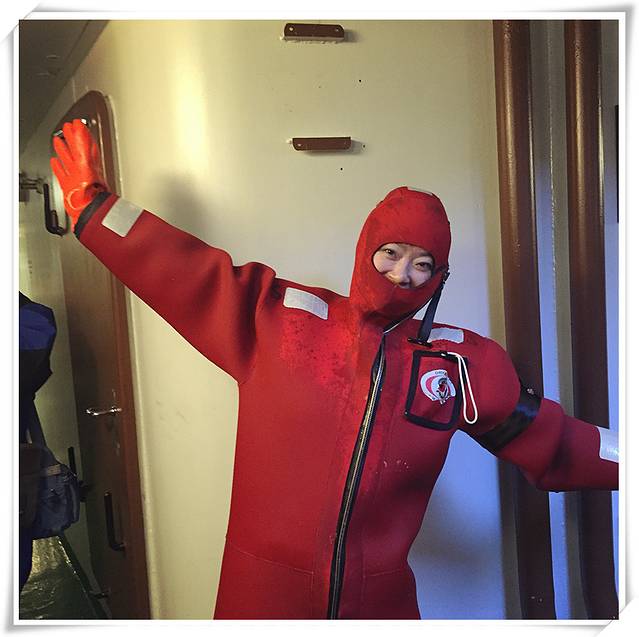 找到位于船尾的更衣室,已经有很多游客换好防护服往外走了,看着他们穿着不合身的衣服,像只企鹅一样一摇一摆好好笑啊。