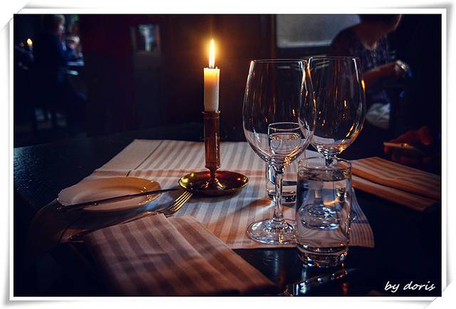 餐厅有专门的衣帽间,自己先去把外套什么的脱了挂好,再由服务生引导到座位上,环境很喜欢,幽幽暗暗的,虽然几乎满桌,但还是很安静.