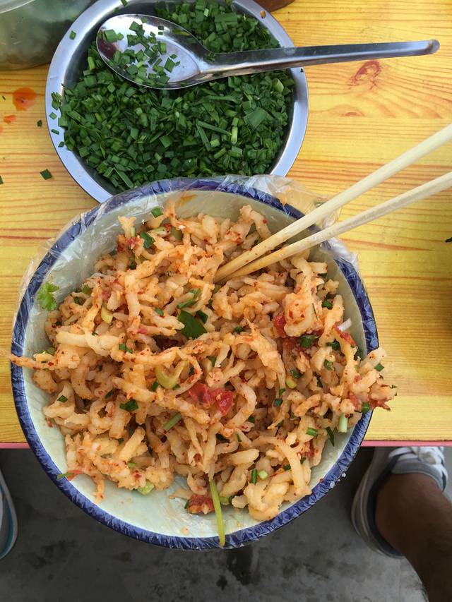拌洋芋擦擦,鉴于我的工作位置,我觉得枣园镇枣园公园对面的加气站门口,有位老大爷的摊子、那个绝对给力。