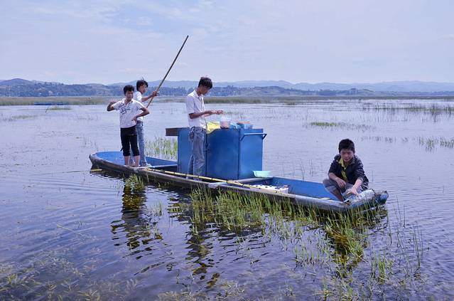 午餐过后,开始去草海游船。游船的费用是包含在今天的包车费用之中的,师傅带我们去了一个小村子,由当地的农民撑船带我们游览。由于是从簸箕湾上的船,不是专门设置的码头,这边的人也很少,湖面上也很静。游船木制,撑篙而行,可坐六人,既舒适,又与原生态自然风景毫无冲突,游船入湖即可看风景,又成为风景的一部分。