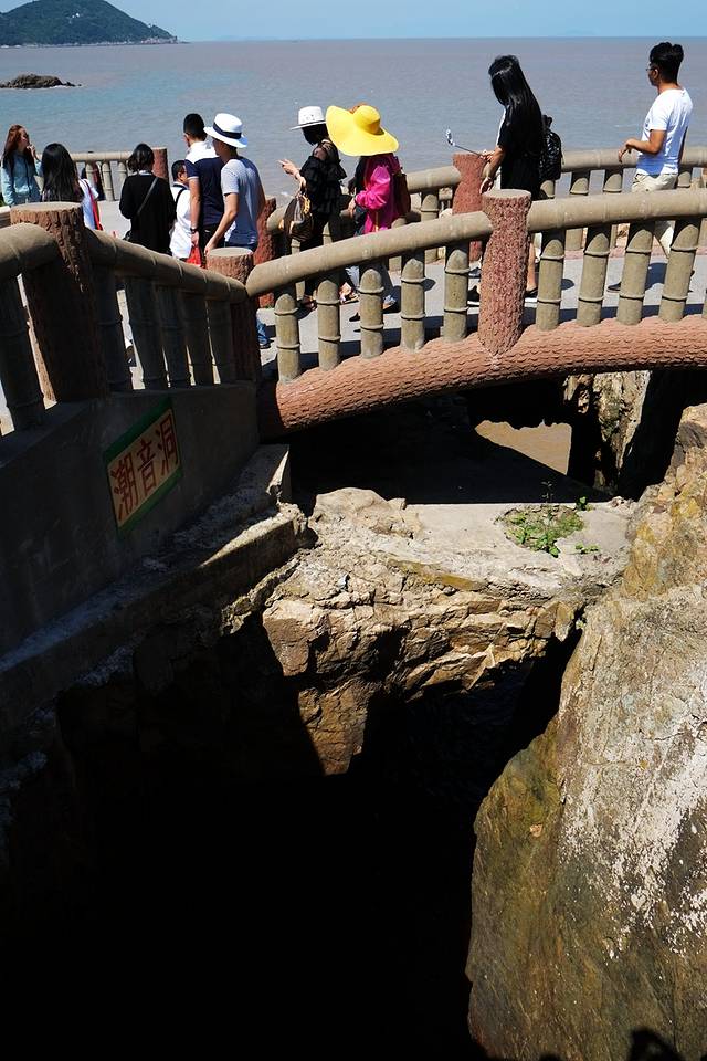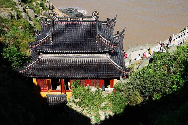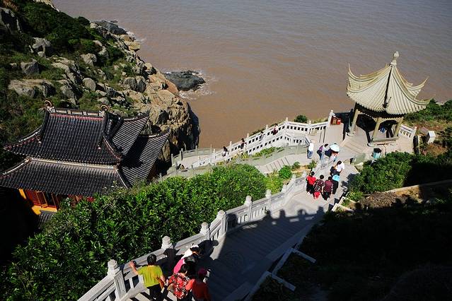5、梵音洞。普济寺停车场坐旅游巴士到梵音洞停车场,下来后走几步就是梵音洞庵,梵音洞在旁边的阶梯下面。梵音洞庵是正殿,门上写着“梵音嘹亮”四个字,但是送子观音不在这里,而是在阶梯下面悬空建在梵音洞上面的瞻圣阁里。如果你和菩萨有缘的话,你可以在瞻圣阁里看见对面山谷里的菩萨。瞻圣阁一共两层,一定要沿着台阶下到第二层,也就是最底层,这里面有一尊送子观音像。