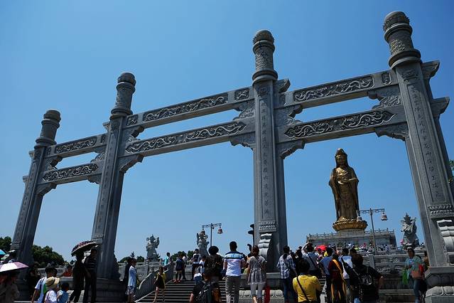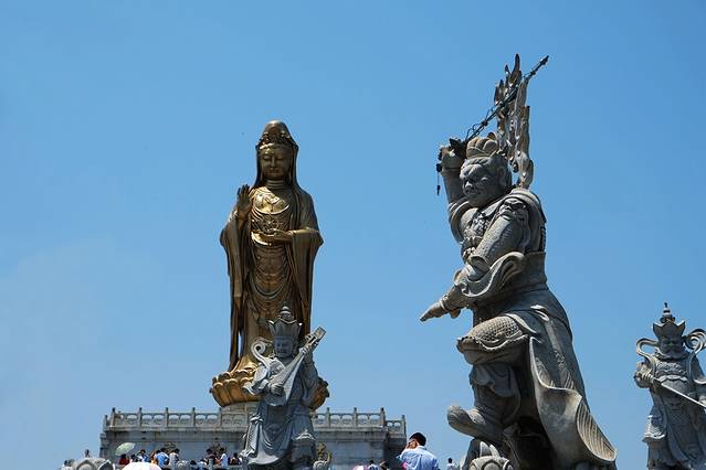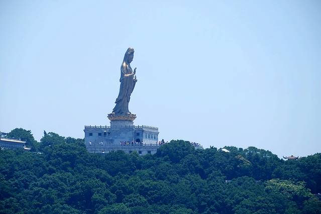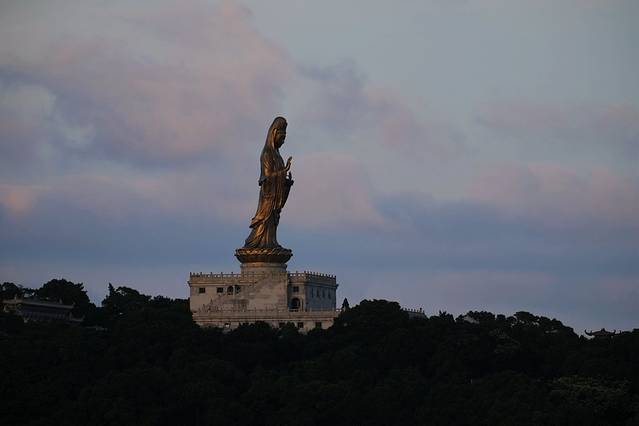 上岛后先徒步到南海观音,因为距离不远,一路上有短姑道头、海岸牌坊、珞珈山码头、南天门等景点,这些地方坐旅游巴士都看不到,快到南海观音的时候会路过紫竹林,不肯去观音院和潮音洞都在里面。紫竹林出来再走不远就是著名的南海观音,旁边的西方净苑和观音跳我们这次去的时候正在维修不开放。这里也可以先去南海观音,返回停车场的时候再游玩紫竹林景区。路边有眺望洛迦山天然卧佛和不肯去观音院全景的观景台,非常不错。