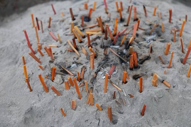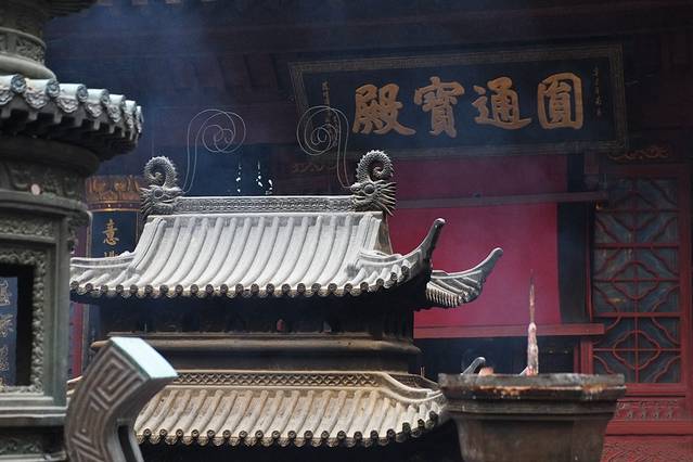 圆通宝殿后面,还有一座铜殿,这是圆通禅林最精华的部分,这里进去不让烧香,而是发给你一小块檀香木,就是图片中这种,把它插到香炉中即可,整个庭院都有一股淡淡的檀香味,特别好闻。