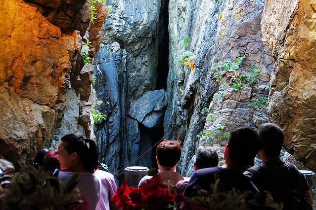 6、善财洞。善财洞也在梵音洞景区,离梵音洞不远,走过去可以从那里回停车场,不用走回头路。善财洞也是一个古老的洞庵,古洞都是很有灵性的,送子观音在正殿后面的右手边,拜完后,可以再拜拜旁边善财洞的善财童子,准备号码吉利的100元的新票,在洞口石壁上摩擦,留着拿回家可以聚财。