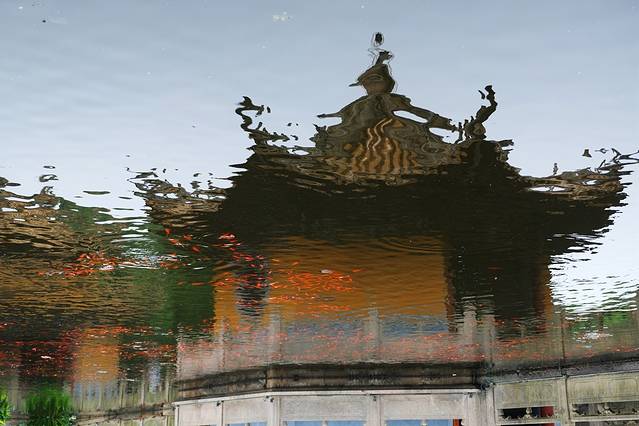 古石桥横卧水波,桥上耸立着一座古亭,在疏朗雄伟中透出股秀灵,真如人间仙境,美轮美奂。池水衬映着古树、梵字、拱桥、宝塔倒影,构成一幅十分美妙的图画。