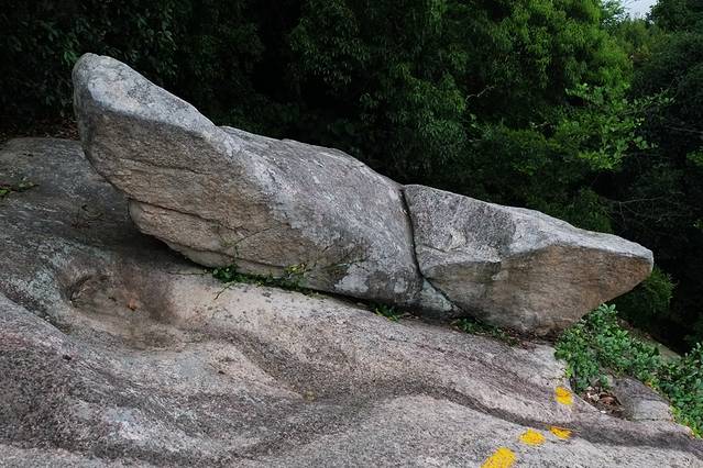圆通禅林的对面,有条废弃的小路,通往这块一叶扁舟石,脚下石壁倾斜陡峭,比较危险,要注意脚下,不要走到黄色警戒线以外,以免滚下山坡。这里虽然有路牌指示,但是因为来的人少,已经基本荒废了,所以网上很少有这块一叶扁舟石的照片。