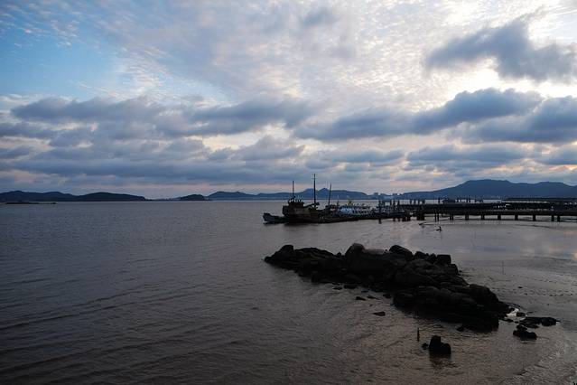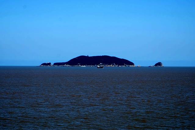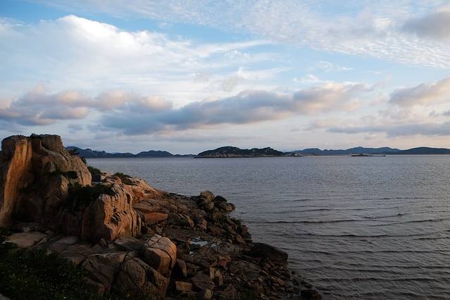 傍晚在天空的映衬下,海水变成了深蓝色,这时候普陀山的景色比白天要漂亮多了。