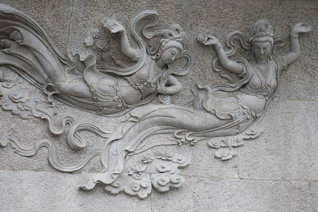 圆通禅院的石刻浮雕廊壁上镶嵌的是大型佛教故事——观世音菩萨普门品,生动地表现了观音菩萨示现种种善巧方便,普度众生的场景。东大殿是水上观音殿,供奉着普陀山最大的观音菩萨卧像。