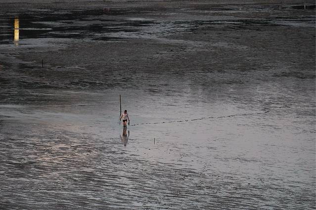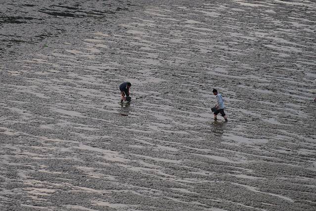 这里应该是退潮以后露出的大片滩涂,这是当地人在赶海吗?