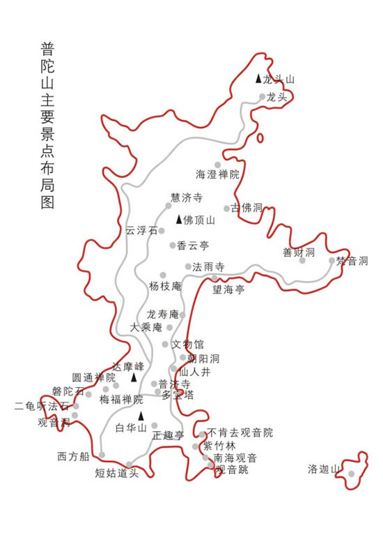 要是准备一日游还一定要去洛迦山话,那就坐最早的一班船(6:20)上普陀山岛,然后来赶7:00或8:00的船去洛迦山,回来再去普济寺、宝陀讲寺、法雨寺和慧济寺,最后再拜南海观音、紫竹林,其他不重要的景点一律放弃,那样的话勉强可以把主要的地方都拜到。