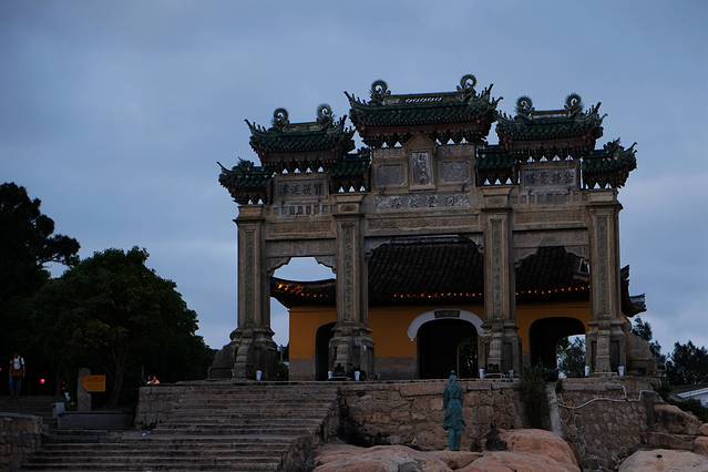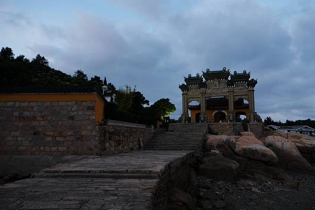 傍晚日落前,可以到南天门去转转(如果觉得晚上去看日落,上午就可以先不去这里),这里会路过金沙海滩、新罗礁、海岸屿,晚上没有南天门几乎没有人,大观蓬小禅院开着门,这里风景特别好,日落也特别漂亮。普陀山晚上没有夜景,一片漆黑,但是到海边的漂亮的百步沙走走,吹吹海风,也很有点独特的意境呢。