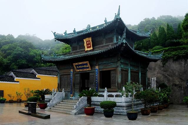 这座铜殿也叫“正法明如来铜殿”、“圆通铜殿”,俗称“铜大殿”,殿内所供奉的佛像全用纯铜铸成,是普陀山唯一供奉铜佛像的大殿。该殿集五台山显通寺铜殿、北京颐和园万寿山铜殿、普陀山法雨寺玉佛殿之众家所长,独树一帜。