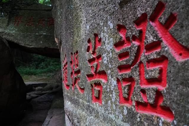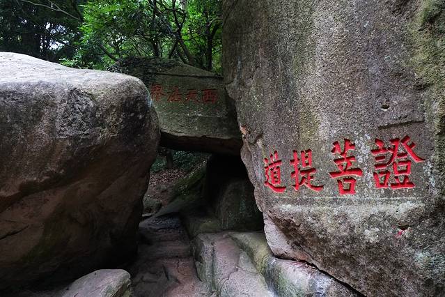 心字石上方,就是西天门,这里有块蛤蟆石与山边的一块巨石相联,两石相峙似门,上又覆巨石,题镌“西天法界”四字,门右巨石上题刻“证菩提道”、“寰海镜清”。