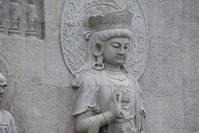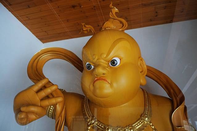 8、法雨禅寺。从慧济寺步行下山,来到法雨寺。法雨禅寺有一个很少人留意的木雕送子观音像,就在法雨寺正殿左边的一个不太容易引起注意的小殿里面,一尊木雕的送子观音,怀里抱着一朵莲花,仔细一看,会发现莲花里还包裹着一个孩子。