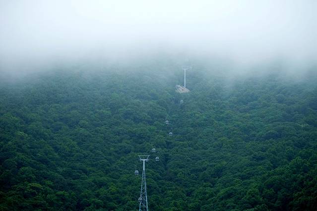佛顶山上的普济寺,可以从法雨寺那里徒步上山,但是比较累,建议坐佛顶山索道(单程40元,往返70元)上山,然后从另一侧徒步下山到法雨寺,一是不用走回头路,二是可以游览山路上的景点。索道下午16:30就结束运营,一定要注意时间安排。上次上佛顶山,天气就不好,在海天佛国崖什么都看不清,那里是普陀山的制高点,景色要是晴天应该很不错的。这次来运气又不好, 望着山顶的云雾,感觉这次上去也看不到什么景色,于是决定放弃。
