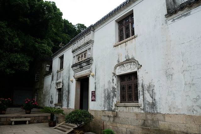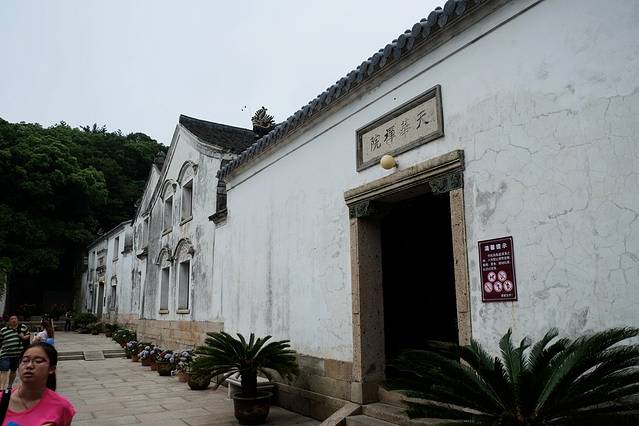 坐旅游巴士来到普济寺停车场,从这里去普济寺走不了多远,会经过一个不太引起人注意的白色外观看上去有点西式的庭院建筑,就在左手边,叫“天华百子堂”。