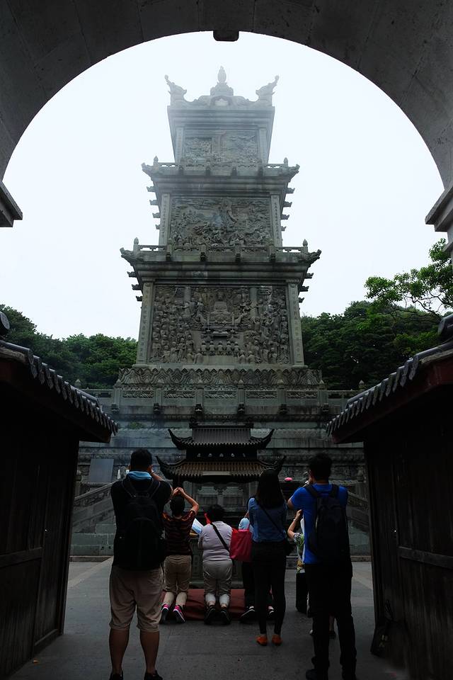 坐旅游巴士来到佛顶山索道下站。这里现在已经形成一个新的景区,有新建的宝陀讲寺和普门万佛宝塔。宝陀讲寺依山而建,气势恢宏,建筑规模与普济寺相近,已经成为普陀山的第四大寺。