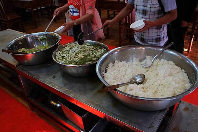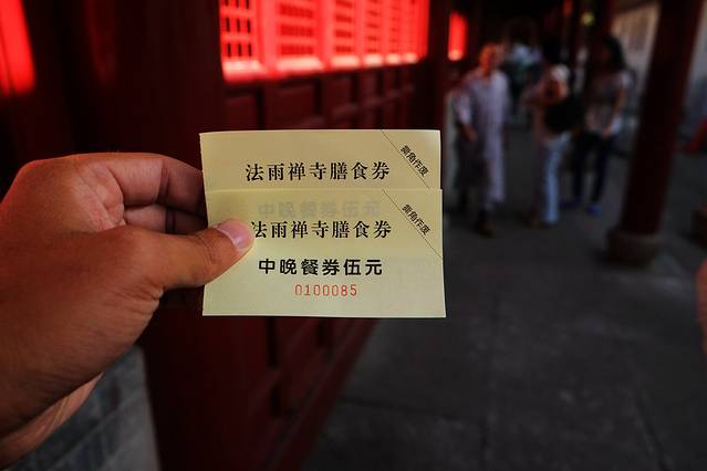 不想花冤枉钱的,建议大家既然是来拜佛的,登岛开始就不要食荤了,普陀山的素斋非常不错,也是一种很好的体验,普济寺、法雨寺、慧济寺三大寺早中晚三顿都提供素斋,午斋10:30-11:30,晚斋16:30-17:30,这个也是卖餐券的时间点,过了这个时间就不卖餐券了,有时候游客少的话,结束时间还会提前一点,建议大家早点去买餐券,可以晚点去吃。以前素斋是10元一人,现在只要5元一人,一碗饭一些菜,吃完再取,吃饱为止不浪费,吃好将碗筷放在外边洗碗处即可。人少的时候有座位,比较悠闲,人多的时候可是连座位都没有的,只能站着吃,饭碗要端着,有个能放菜碗的地方都谢天谢地了。我们这次去的时候人不多,除了米饭还有素水饺,特别好吃。