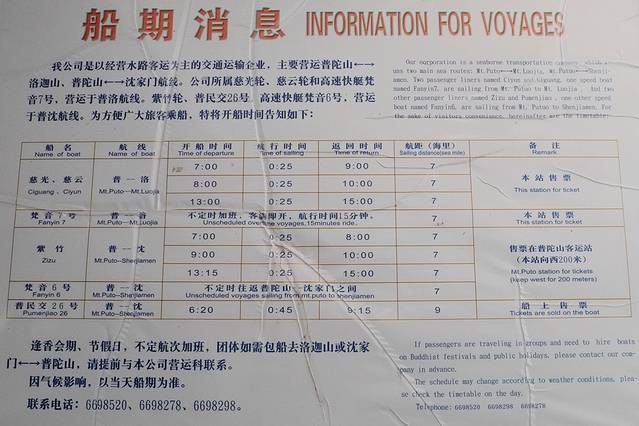 游船售票处的这个告示里面说每天去洛迦山的船只有7点、8点、13点3趟,也有说上午9点还有一趟的。我们比较懒,时间充裕,所以没赶7点那班,坐8点那班可以多睡会儿。