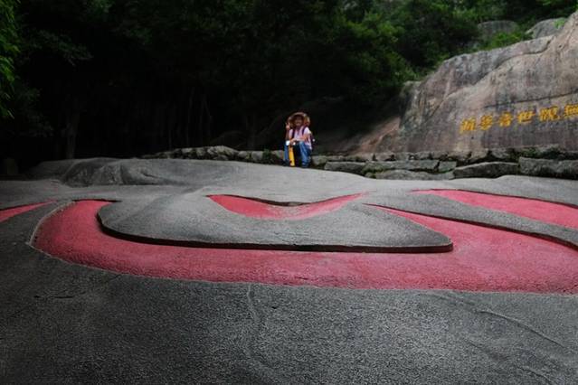 一个长5米、宽7米、周边近50米的红色“心”字刻于石上。中心的一点可容八、九人同坐,整个“心”字可容近百人打坐,是普陀山上最大的石刻。
