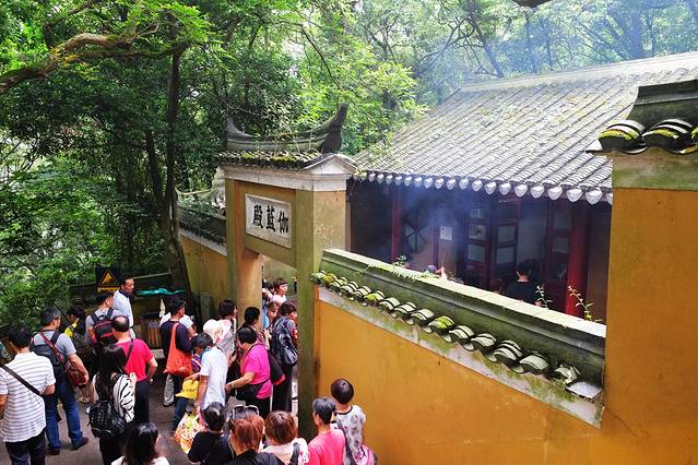 这里也不用走回头路,万佛塔下来回到佛顶山索道下站,坐索道上佛顶山景区(建议坐索道单程上山,从佛顶山另一侧走下山到达法雨寺,下山比较轻松,还可以多看几个景点),佛顶山上有著名的慧济寺、鹅耳枥树、海天佛国崖、刀劈石,山头不大,逛完后从另一侧下山,路过云扶石、香云亭。