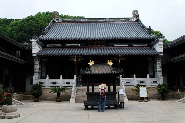 7、慧济禅寺。从梵音洞停车场坐旅游巴士到佛顶山索道,坐索道上去佛顶山的慧济寺。慧济禅寺主殿堂左手的不二法门“观音堂”,正面供奉观音菩萨和背面供奉的白玉注生娘娘,这是到普陀求子必须要拜到的注生娘娘,也就是众人所说普陀最灵验的送子娘娘,注身娘娘身前没有铺垫,诚心的可以直接跪在地上虔诚地叩拜。