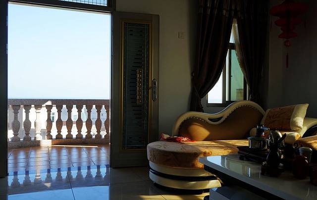 位于四楼的大厅,阳台正对着大海。布衣沙发搭配欧式黑白相间桌子,给房间的装修拉上不是一个档次。