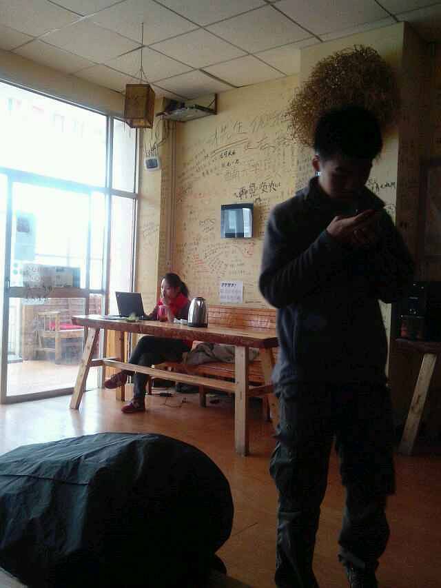 这是客厅,很开放,有书,有电脑,墙上都是留言,这张照片我拍完后才发现鸟窝正好在这个男生头上。还以为他是爆炸头呢