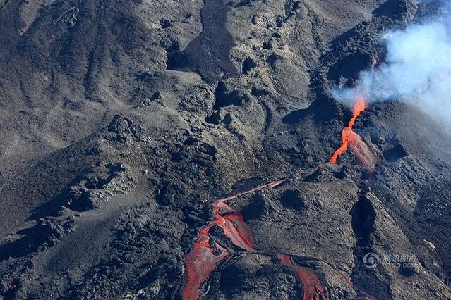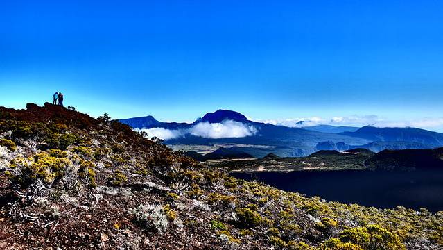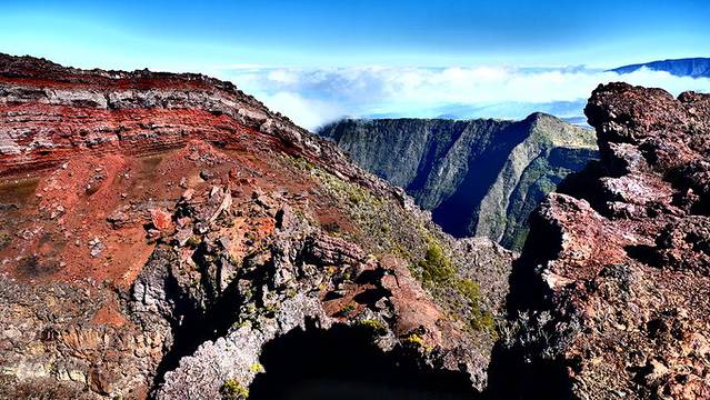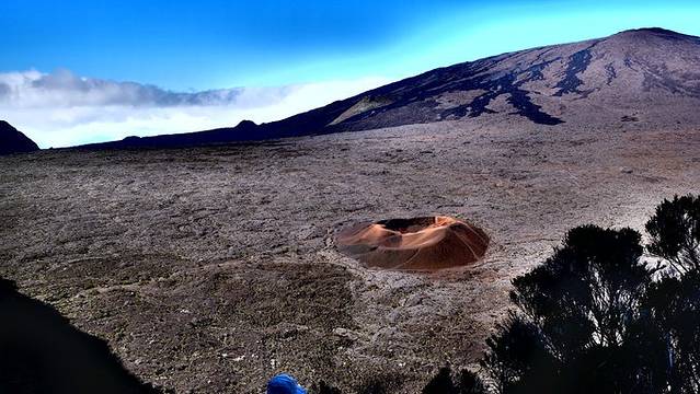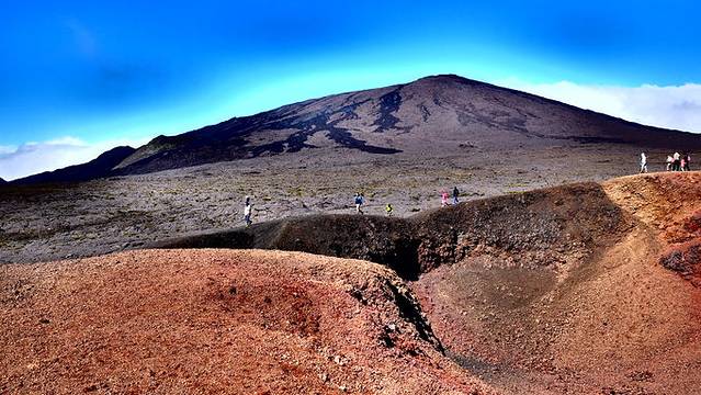 富尔奈斯火山是世界上最容易接近的活火山之一,并且可以徒步行到火山边缘,我们不断爬升,一路风景也不断变化,之前的草地和柳杉林逐渐变成灌木丛林和活性般的贫瘠地貌,走过贝尔孔布(Pas de Bellecombe)通道(倍儿恐怖通道?),我们来到世界尽头。