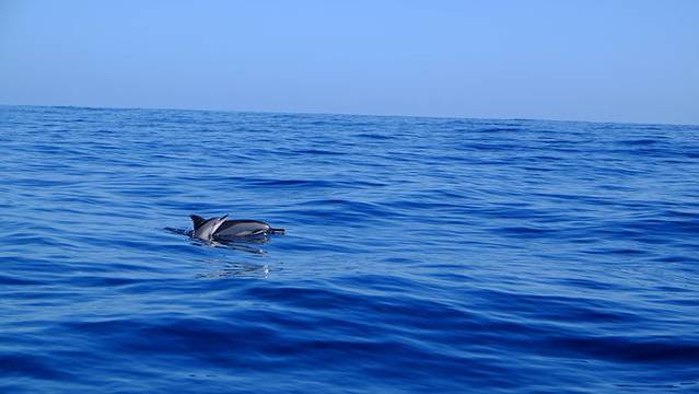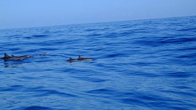 当天,我们运气很好,不多久就看到成片的海豚,如果你水性好、体力好就可以下水和海豚同游,就是体力消耗巨大、海水齁咸,而且海水见人就散,很傲娇的说。