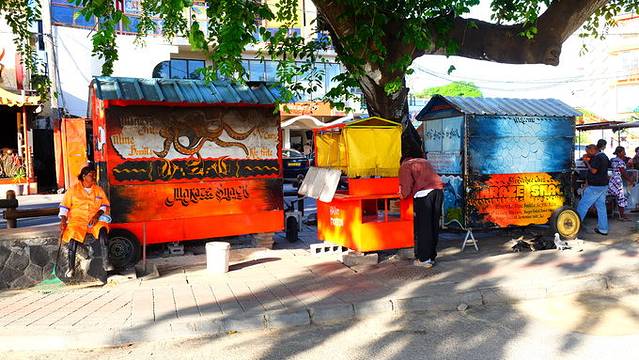 再往北行是圣保罗,曾经是留尼汪的首都,这里能看到印度风格的东西,颜色浓烈,和圣吉尔莱班比,看起来略接地气,也略凌乱,最有名的是海滨步行区里周五周六的圣保罗集市,但看起来,他们乱糟糟的,卖一些并不精致的小手工艺品,卖给那些外国人(事实上这个集市是欧洲人炒起来的),所谓的当地蔬菜、水果和香料构成的鲜艳图画应该在任何一个热带国家都能看到。