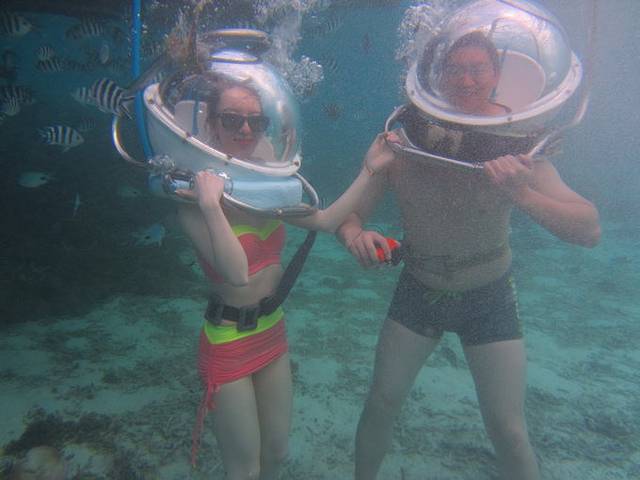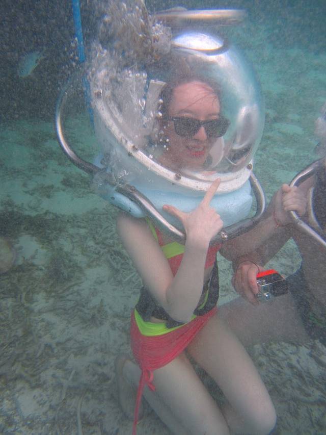 水上三项第三项就是海底漫步,大概潜到水底两三米,意思意思走两步,缺乏安全感的人啊,小心肝真是受不了,加上头盔重到人发抖,怎么说呢,体验大过有趣吧。