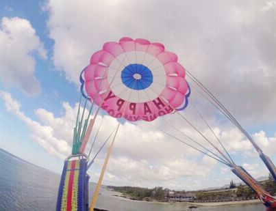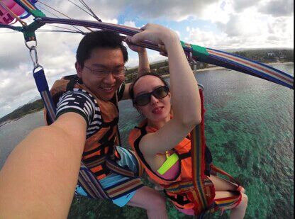 这是第二个项目,空中降落伞,游船上的小黑哥慢慢放线把我们放到高空中(放风筝?!),比皮划艇平稳安逸多了,慢慢升空,慢慢看到全景的海洋,景色非常好,只是喜欢刺激的小伙伴应该会喜欢塞班岛把你放到空中又把你降到水里的玩法。