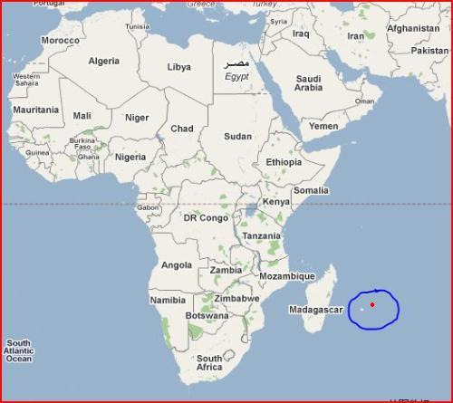 听起来很废话,毛球当然在非洲,在印度洋上,赤道以南的地方,但这也是大多数人对毛球地理位置的所有印象,我想要说的是,其实它在赤道以南、并且差不多南回归线附近,所以,北半球夏季去的小伙伴们还是不要掉以轻心只带沙滩短裤长裙凉拖,晚上海边起风的时候还是需要一些御寒衣物或者围巾的,不要像我,毫无防备,最后还要在毛球买东西,上个图给个直观赶脚。蓝色圈中的红色小点点就是毛球(哦,简直小到无法直视),离赤道还是蛮远的对不对!