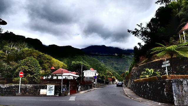 从萨拉济盘旋而上,大约近10公里,就到了我心心念念的彩色农庄海尔村(Hell-Bourg),它得名于前总督海尔上将,实际上并不地狱,并且房子五颜六色像打翻调色盘很美好的,山岩围绕着这个童话小村庄,村庄时不时被裹在云端里。