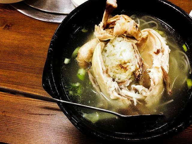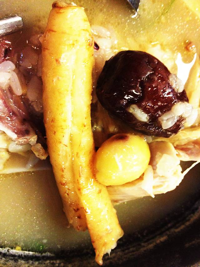 鸡肚子里很多料~~手指粗的高丽人参煮到像土豆泥一样的口感;红枣;银杏;栗子;糯米,丰盛至极~~