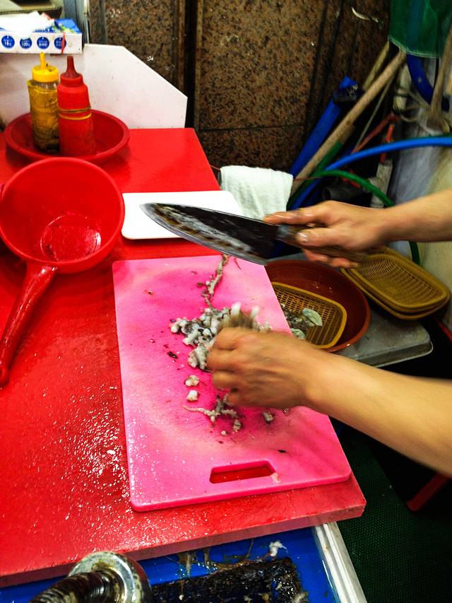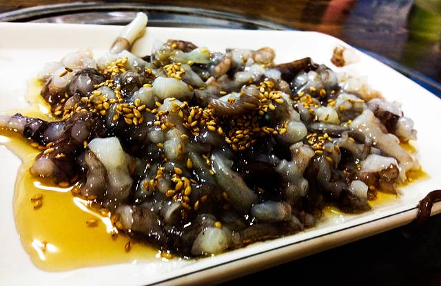 开价一盘30000W,还价到20000W。抓出来,蹬蹬磴几下手起刀落,3只章鱼5秒内被碎尸万段。浇上麻油,撒上芝麻,上桌。
