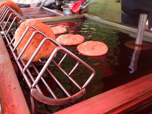 老爷爷正在做的这个饼挺好吃的,后面那张就是成型品了~~