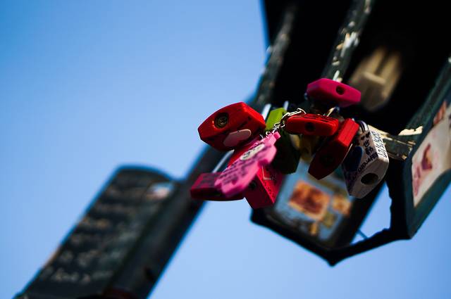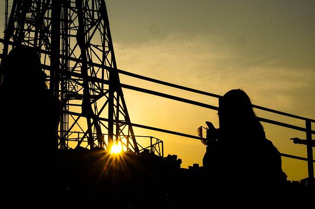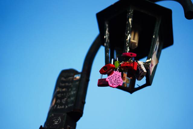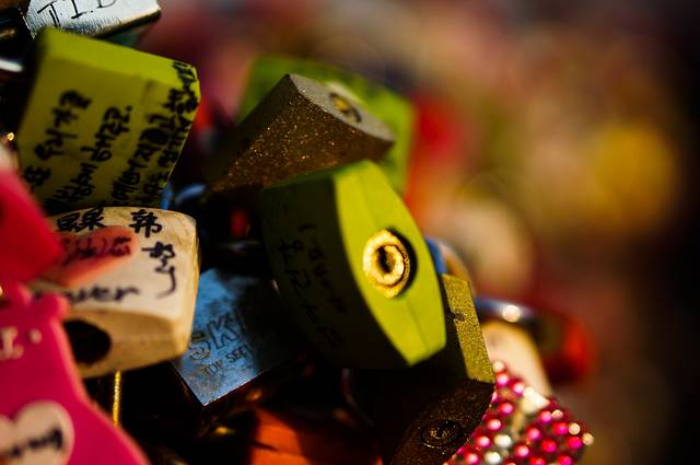 南山塔前的爱情锁墙天台,联合国游客大晒场,恰逢日落前夕,来张剪影代替到此一游。