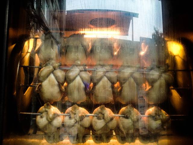 出来才发现,门口有个玻璃橱窗,一只只鸡赤膊着接受酷刑~~~好有爱~~~有木有~~