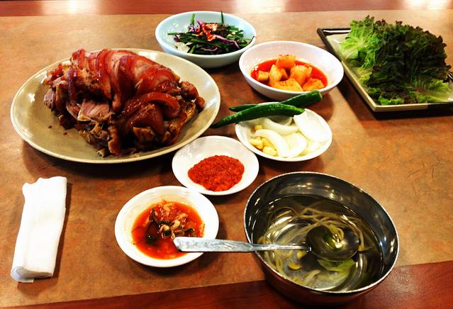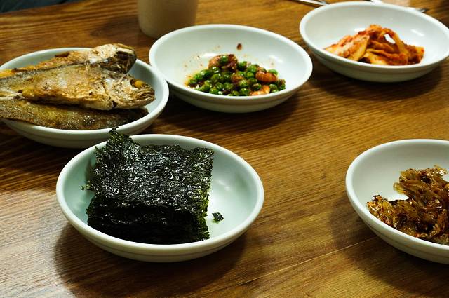 如图5个菜+豆腐汤+米饭。偶自娱自乐发现新大陆,这个海苔包米饭,中间再加右下角的鱼干~~意外的好吃,不知不觉一碗饭就吃光了!! (所有配菜和米饭都可以无限加)