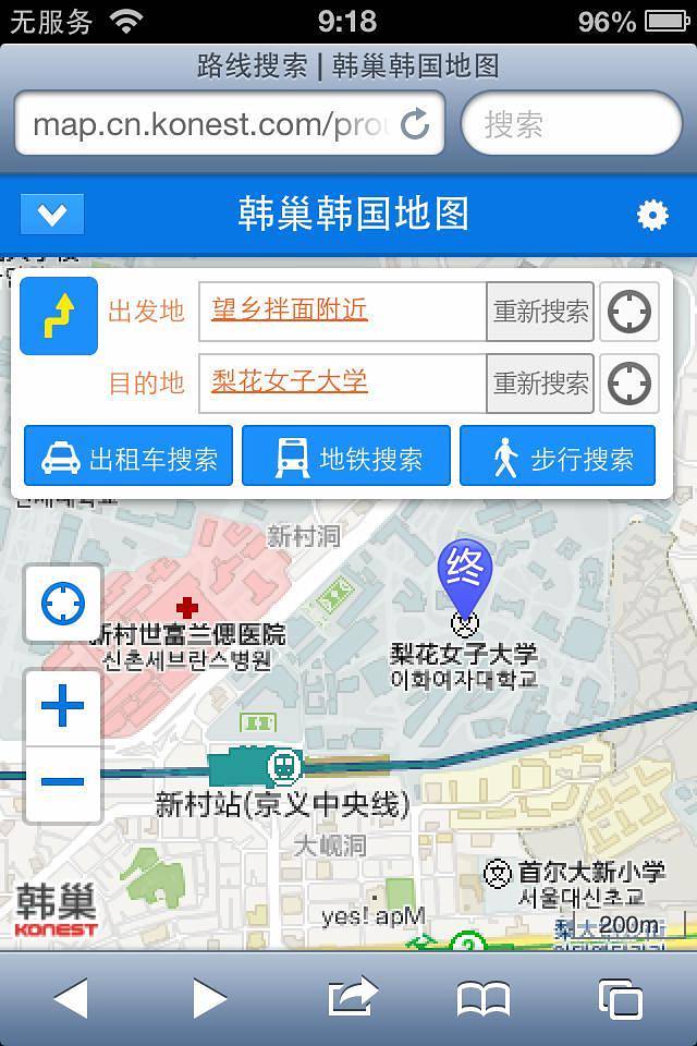 google地图可以用来定位,然后跟着标点走,但是google是英文或者韩文的,英文也是韩语发音来的,根本看不懂。所以配合另一个神器,”韩巢地图“,很实用,可惜只有网页版。但2个配合起来使,杀遍思密达无忧!