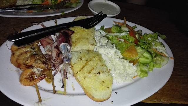 我们的晚餐——沙滩BBQ,4刀一份,包括面包、蔬菜沙拉、配以牛肉、猪肉、海鲜、鱼、鱿鱼等。