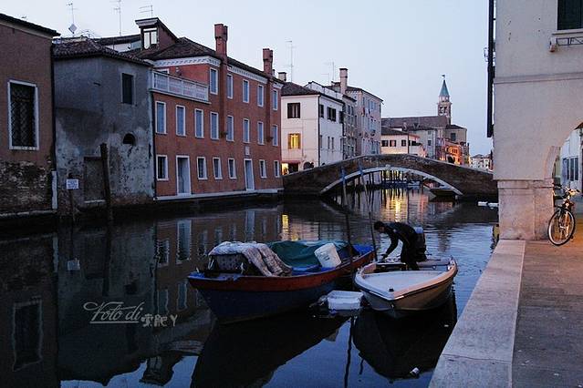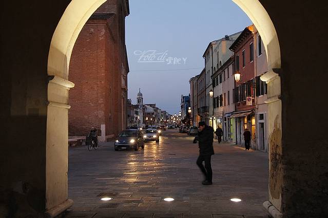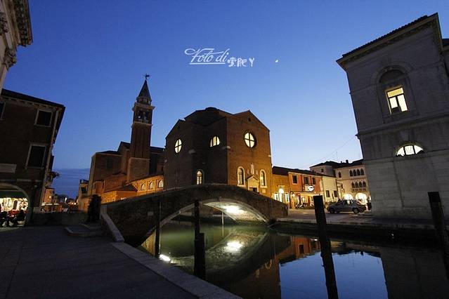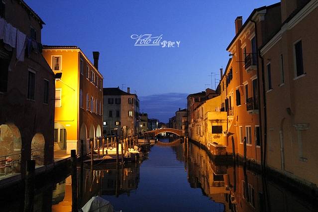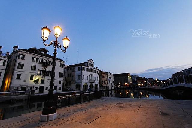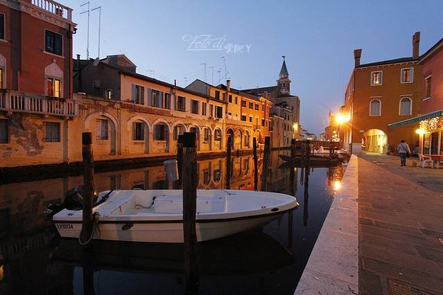 到达基奥贾已经太阳西斜,停了车,在旅馆休息了一小会儿,再出门发现小渔村已经沉浸在淡蓝的暮色里了。河边的路灯都亮了,暖黄的灯光成串倒影在水里,象项链。